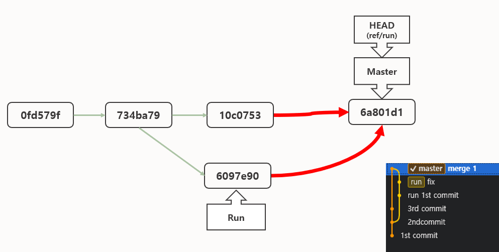 그리고 run branch를 merge 하기 위해서 아래와 같은 명령어를 사용해봅시다.