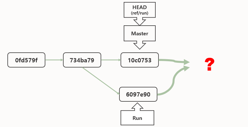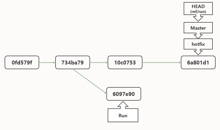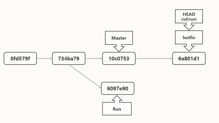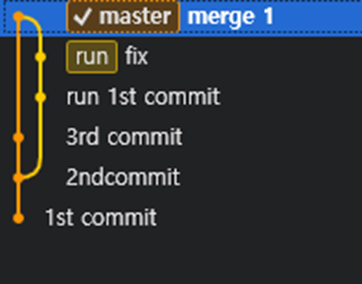 해당 상태에서 run을 master에 병합하기 위해서 run branch에서 master branch로 이동합시다.