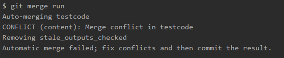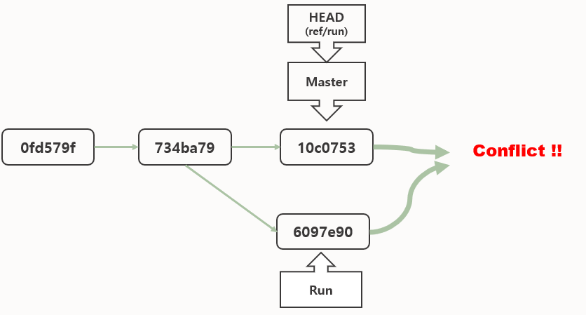 즉 master에서 master code라고 쓴 부분과 run에서 run code라 쓴 부분이 충돌이 일어났습니다.