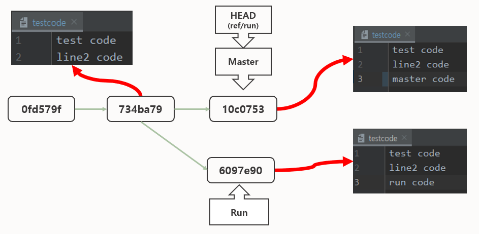 base에는 없는내용, master에는 master code, run에는 run code
