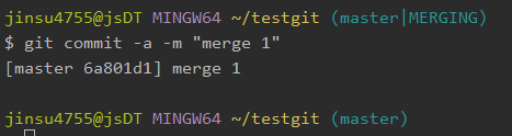 다음과 같이 문서를 수정하고 add하고 commit하면서 commit 내용은 merge 1이라고 적어주었습니다.