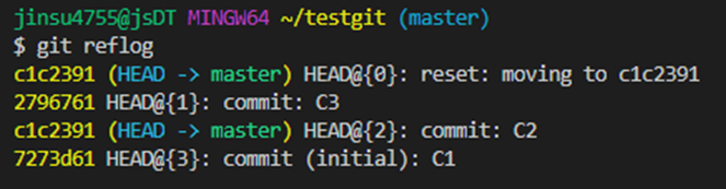 현재 사진의 경우 C1->C2->C3 순서로 커밋을 진행하고 마지막에 git reset으로 c1c2391번으로 돌아갔다 즉 C2로
