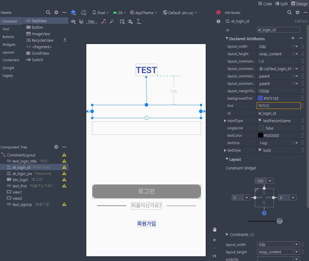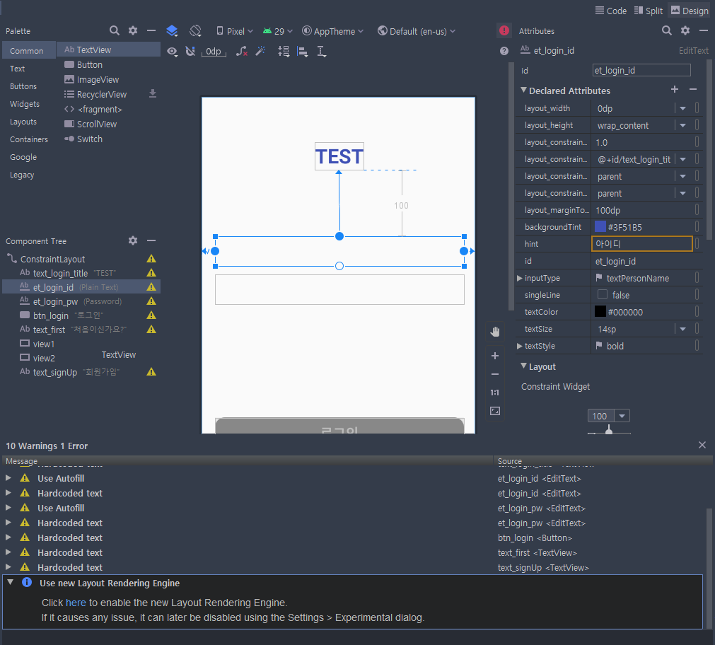 다시 시작하게 되면 해당 Use new Layout Rendering Engine라는 로그가 사라지고 EditText가 보이는 것을 확인 하실 수 있습니다.