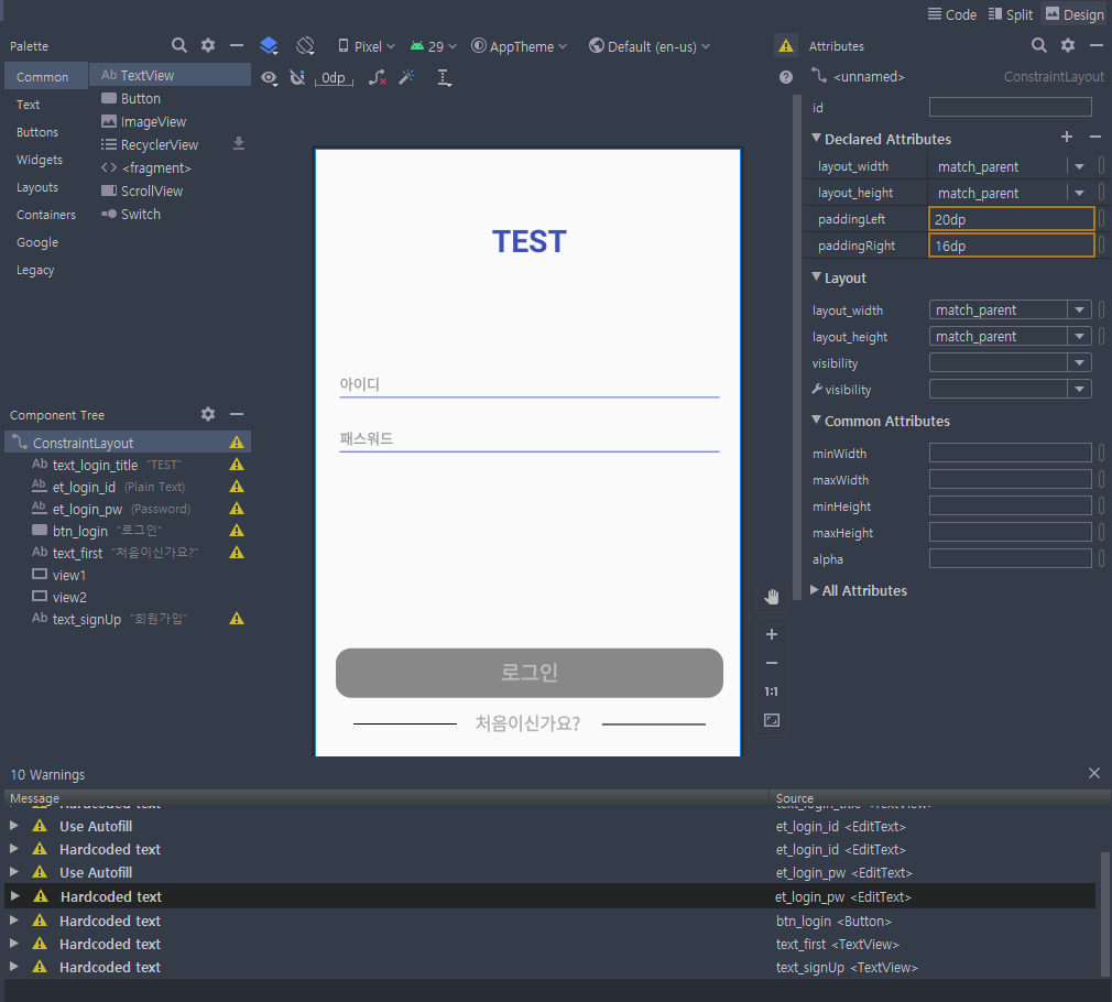 안드로이드 스튜디오 xml 편집 환경에서 오른쪽 상단에 뜨는 표시에서 로그켓 처럼 해당 로그의 레벨을 확인하는 것이 가능합니다.